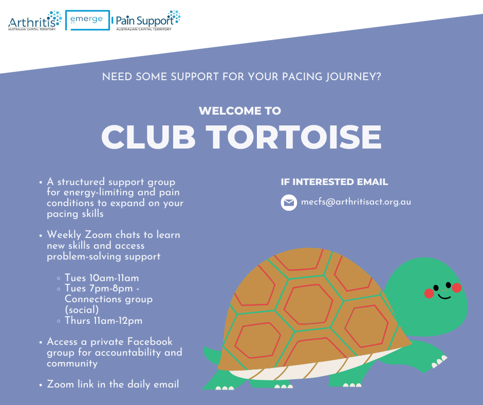 Club Tortoise is an ongoing, flexible weekly program for learning and problem-solving pacing skills for managing chronic conditions. It consists of weekly Zoom peer support groups and a private Facebook page for participants to connect between sessions. Each session of the support groups will begin with a short 3-5 minute presentation on an element of pacing or living with chronic illness and then will be open to discussion and problem-solving for participants. No experience necessary! Pop in and out as you need. Club Tortoise is an extension on our self-help course and the Long COVID factsheets and provides additional support from facilitators with lived experience of fatiguing and pain conditions.