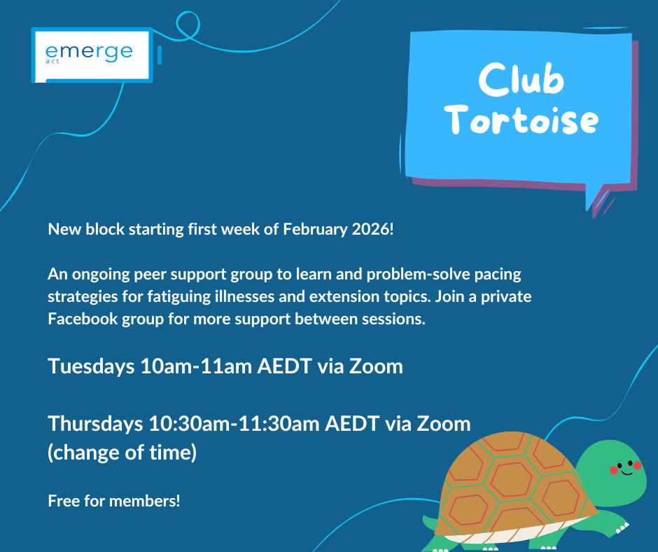 Club Tortoise is an ongoing, flexible weekly program for learning and problem-solving pacing skills for managing chronic conditions. It consists of weekly Zoom peer support groups and a private Facebook page for participants to connect between sessions. Each session of the support groups will begin with a short 3-5 minute presentation on an element of pacing or living with chronic illness and then will be open to discussion and problem-solving for participants. No experience necessary! Pop in and out as you need. Club Tortoise is an extension on our self-help course and the Long COVID factsheets and provides additional support from facilitators with lived experience of fatiguing and pain conditions.